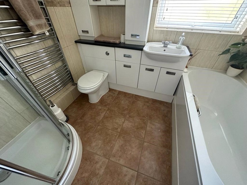 Comprising shower, concealed cistern wc with adjacent vanity wash hand basin, bath, tiled floor and walls, obscure UPVC double glazed window, heated towel rail
