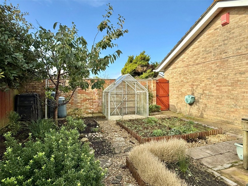 The large south facing rear garden has a multiple seating areas with the garden predominantly laid to lawn with mature trees and shrub borders, panel fencing and additional space for a Greenhouse and vegetable garden, side gate leading to the front